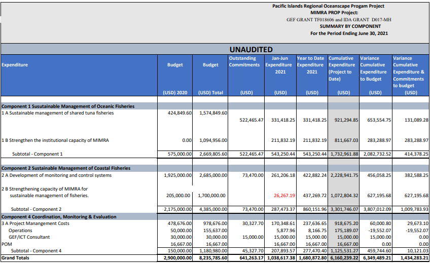 Eventually, all established packages both supply and consulting services under PROP have been signed and contracted. Implementation work will go on till around August to early September, 2021. However, there are some small tasks under Incremental Operating costs that will be procured and eventuate until nearing the end of the project life cycle like conference, trainings and small individual consultancy. It is about 95% of total PROP operation work has been completed and about 98% of data uploading in STEP has been completed. The Pacific Islands Forum Fisheries Agency (FFA) and MIMRA had finally signed the termination agreement and finalized the regional collaboration and engagement portion of the project. The Project’s second restructuring exercise was approved by the World Bank on September 7, 2020. The restructuring included a 12-month, no cost extension of the IDA grant closing date to September 30, 2021. This extension is expected to ensure that the project has sufficient time to deliver all remaining programmed activities as well as successfully achieve the PDO and deliver forecasted outcomes.